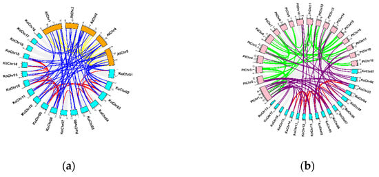 Collinearity analysis of KoNAC genes. (a) Genes in 5 chromosomes of A. thaliana (AtChrs), in orange, and 18 chromosomes of K. obovata (KoChrs), in cyan, are introduced here. The orthologous pairs between KoNACs and ANACs are highlighted in blue. The gene pairs among ANACs are colored in yellow, while the gene pairs among KoNACs are colored in red. (b) Genes in 19 chromosomes of P. trichocarpa (PtChrs), in pink, and 18 chromosomes of K. obovata (KoChrs), in cyan, are introduced here. The orthologous pairs between KoNACs and PtNACs are highlighted in purple. The gene pairs among PtNACs are colored in green, while the gene pairs among KoNACs are colored in red.