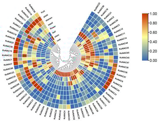 To gain an insight into the function of NAC genes in K. obovata, the expression levels of all KoNAC genes in various organs, including root, stem, leaf, flower, pistil, stamen, sepal, and fruit were determined based on previously published RNA-seq data of K. obovata. Noticeably, the expression patterns of KoNAC genes were not in a constitutive mode, whereas they were differentially and preferentially expressed in different organs (Figure 6, Table S4). For example, 28 out of 68 KoNAC genes were highly expressed in roots, while 18 KoNAC genes were preferentially expressed in leaves, and 13 KoNAC genes were mainly expressed in fruits.
