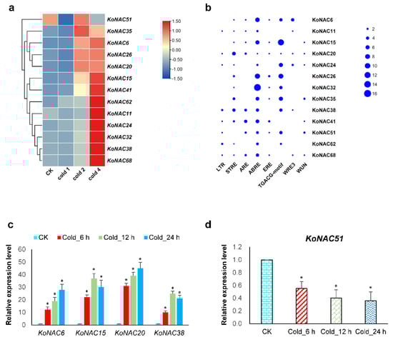Expression analysis of KoNAC genes under cold treatment. (a) The transcript levels of the KoNAC genes in response to cold were determined based on publicly available RNA-seq data (NCBI BioProject: PRJNA678025). Deeper red colors represent higher expression levels of up-regulated KoNAC genes, while darker blue colors indicate higher values of down-regulated KoNAC genes. Cold 1, first-time cold treatment; Cold 2, second-time cold treatment; Cold 4, fourth-time cold treatment. (b) The cis-regulatory elements in the promoters of the 13 KoNAC genes were predicated by PlantCARE. Eight well-known stress-related elements were identified. The size of the blue ball indicates the number of the elements in the KoNAC promoters. Expression levels of four upregulated KoNAC genes (c) and one down-regulated KoNAC (d) under cold treatment were confirmed by qRT-PCR. Three independent experiments were performed. The actin gene in K. obovata acted as the internal control. Asterisks indicate significant differences compared with CK by Student’s t-test. *, p < 0.05.