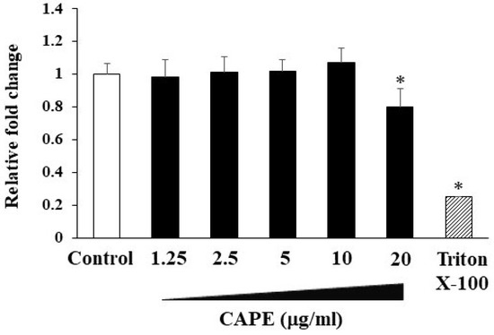 The effects of CAPE on cell viability of HDPCs. HDPCs were seeded with CAPE (1.25–20 μg/mL) for 24 h. Cell viability was assessed using Cell Counting Kit-8. Treatment with Triton X-100 was used as a positive control. Results are expressed as fold-change values relative to unstimulated control samples. Values represent the means ± SDs from representative of three independent experiments and each experiment was performed in triplicate. Asterisks indicate significant differences versus control (without CAPE) (∗ p < 0.05).
