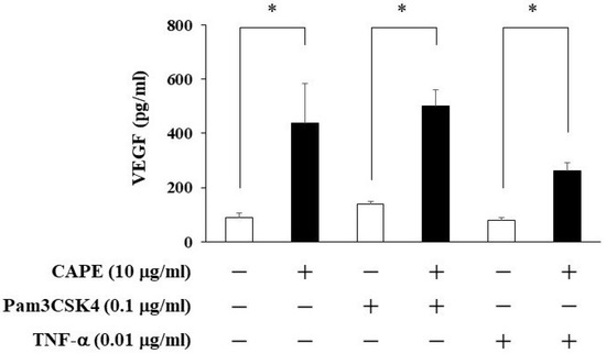 The effects of CAPE on VEGF production from HDPCs. HDPCs were treated with Pam3CSK4 (0.1 μg/mL) or TNF-α (0.01 μg/mL) and/or CAPE (10 μg/mL) for 24 h. After stimulation, the culture supernatants were collected, and the levels of VEGF were measured using ELISA kits. Values represent the means ± SDs of three independent experiments. Asterisks indicate significant differences versus control (without CAPE) (∗ p < 0.05).