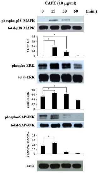 To confirm the effect of CAPE in HDPCs involved in MAPKs’ phosphorylation, the phosphorylation of MAPKs was analyzed using Western blot analysis. We showed that CAPE induced the phosphorylation of p38 MAPK, ERK and SAP/JNK in HDPCs at a relatively early stage (Figure 4). The graphs show the ratios of phospho-p38 MAPK, phospho-ERK, and phospho-SAP/JNK expression to total p38 MAPK, total ERK, and total SAP/JNK, respectively.
