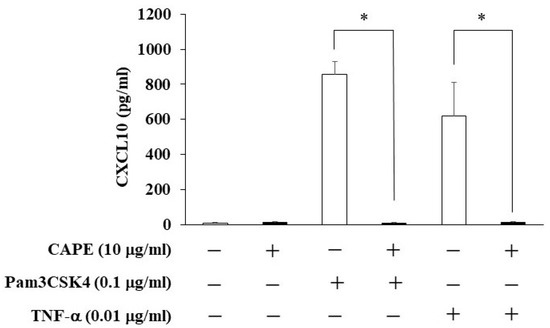 The effects of CAPE on CXCL10 production in Pam3CSK4- and TNF-α-stimulated HDPCs. HDPCs were treated with Pam3CSK4 (0.1 μg/mL) or TNF-α (0.01 μg/mL) and/or CAPE (10 μg/mL) for 24 h. After treatment, the culture supernatants were collected and the levels of CXCL10 were measured using ELISA kits. Values represent the means ± SDs of three independent experiments. Asterisks indicate significant differences versus control (without CAPE) (∗ p < 0.05).