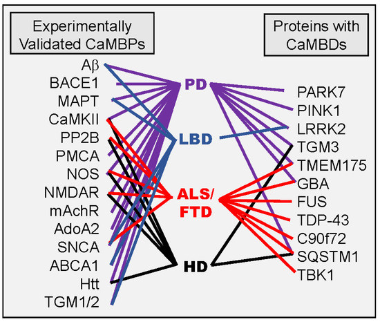 As a major cause of the diversity of psychological disorders during the early disease stages and subsequent dementia, understanding the underlying events of neurodegeneration is critical. Calmodulin is a common denominator in all aspects of Alzheimer’s disease, the primary neurodegenerative cause of dementia, from the generation of the classic hallmarks—amyloid beta plaques and neurofibrillary tangles—to the regulation of critical receptors and biomarkers [8,9,10]. The calmodulin hypothesis, an extension of the calcium hypothesis of Khachaturian, has been shown to be applicable to neuroinflammation in AD, HD, PD, LBD, and other neurodegenerative diseases [6,7,10]. Neuroinflammation has been linked to several psychological disorders including anxiety, depression, and schizophrenia [35]. The analyses here have shown that many key marker and risk proteins for HD (Huntingtin, TGM1, TGM2), PD (α-synuclein, PINK1, LRR2, PARK7), LBD (TMEM175, GBA), and ALS/FTD (TDP-43, SQSTM1, FUS, TBK1, C9orf72) all possess identifiable CaMBPs each with one or more binding motifs.