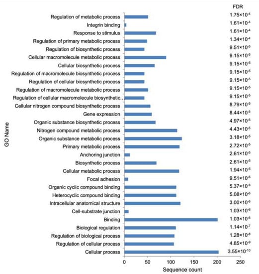 The top 30 most enriched gene ontology (GO) terms of C. rotundicauda differentially expressed genes (DEGs). Sequence count and false discovery rate (FDR) are shown.