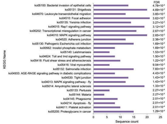 Figure 3 shows the results of the KEGG enriched pathway analysis of C. rotundicauda DEGs. Several pathways related to immune defence, such as Toll and Imd signalling pathway, apoptosis, MAP kinase (MAPK) signalling pathway, inositol phosphate metabolism, phagosome and leucocyte endothelial migration, leucocyte endothelial migration, and infection with gram-negative bacteria, were enriched. Pathways related to infections, such as bacterial invasion of epithelial cells, viral myocarditis, malaria, leishmaniasis, and bacterial infections (Escherichia coli, Salmonella, Shigella, Yersinia, and Pertussis), were also enriched.