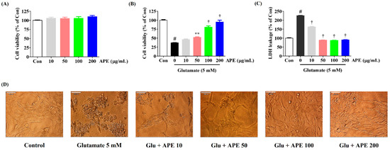 The HT22 mouse hippocampal neuronal cell line was purchased from the American Type Culture Collection (Manassas, VA, USA) and grown in a DMEM medium that contains 10% of FBS and 1% of antibiotics at 37 °C in a 95% air/5% CO2 incubator. The cells were treated with 5 mM glutamate in the presence or absence of APE (10, 50, 100, or 200 μg/mL).
