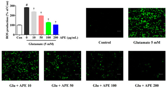 Intracellular ROS levels were measured using H2DCFDA. The HT22 cells were treated with APE at concentrations of 10, 50, 100, or 200 μg/mL for 2 h before exposure to 5 mM glutamate for 6 h. After stimulation with glutamate, the cells were stained and incubated in darkness with 10 μM H2DCFDA for 30 min. Fluorescence (an excitation wavelength of 485 nm and an emission wavelength of 525 nm) was estimated using a microplate reader. Representative fluorescence images were obtained using a fluorescence microscope (Eclipse Ti, Nikon, Tokyo, Japan).