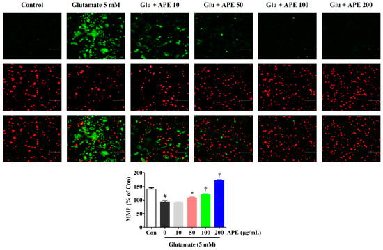 To determine whether the neuroprotective effects of APE are due to the preservation of mitochondrial function in glutamate-treated cells, we examined MMP using a JC-1 fluorescence staining assay. JC-1 aggregates in normal mitochondria and exhibits red fluorescence, which is indicative of normal MMP. Green fluorescence is exhibited when mitochondria have depolarized during apoptotic cell death. As shown in Figure 3, the control cells predominantly exhibited red fluorescence, with little green fluorescence. However, cells treated with glutamate for 24 h showed an increase in green fluorescence and concomitant disappearance of red fluorescence. APE treatment (50, 100, or 200 μg/mL) of the glutamate-damaged cells produced a decrease in green fluorescence and an increase in red fluorescence intensity. In particular, at a concentration of 200 μg/mL, APE caused a JC-1 distribution similar to that in control cells (Figure 3). To quantify these MMP changes, the red/green fluorescence intensities were measured using a fluorescence plate reader. Compared to the control cells, a significant reduction of red/green fluorescence was observed in glutamate alone-treated cells. However, pretreatment with APE dose-dependently elevated the red/green fluorescence intensity.