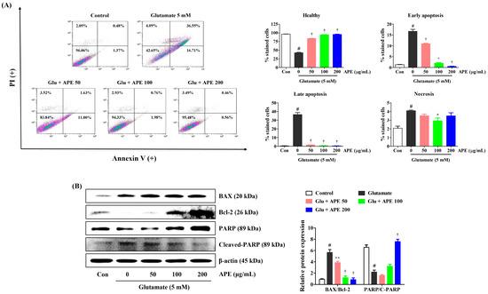 Glutamate-induced apoptotic cell death, and its inhibition by APE, were determined using the annexin V-FITC/PI Apoptosis Detection Kit. The HT22 cells were treated with APE at concentrations of 50, 100, or 200 μg/mL for 2 h before exposure to 5 mM glutamate for 24 h. The cells were harvested and stained with 5 μL of annexin V-FITC/PI at 37 °C in darkness for 15 min. They were then analyzed using flow cytometry (FACS Calibur, BD Biosciences, Franklin Lakes, NJ, USA).