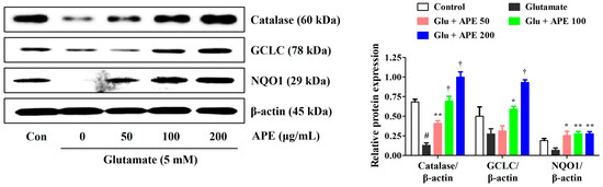 To elucidate the antioxidative mechanisms of APE against glutamate-induced cell injury, we measured the production of the antioxidant enzymes, catalase, GCLC, and NQO1, by Western blot. Our results showed that glutamate significantly reduces the expression of catalase, GCLC, and NQO1. In contrast, pretreatment with APE notably enhanced the levels of these enzymes (Figure 5). These data suggest that the expression of catalase, GCLC, and NQO1 is implicated in the preventive action of APE against glutamate-induced oxidative stress.