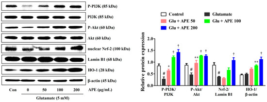 To investigate the mechanisms underlying the prevention of glutamate-induced apoptosis, we analyzed the effects of APE on the expression of PI3K/Akt and Nrf-2/HO-1 in HT22 cells. A previous study has found the PI3K/Akt signaling pathway to be important for the activation and nuclear translocation of Nrf-2 [19]. Activation of the PI3K/Akt/Nrf-2 signaling pathways has also been shown to be closely related to neuroprotective activity [9]. Therefore, the effects of APE on the expression of PI3K/Akt, Nrf-2, and antioxidant enzymes were determined by Western blot. As shown in Figure 6, pretreatment with APE dramatically increased the phosphorylation of PI3K/Akt compared with that of cells treated with glutamate alone. Additionally, APE treatment increased nuclear translocation of Nrf-2 and its downstream HO-1 expression in a concentration-dependent manner (Figure 6).