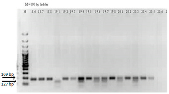 The PCR fragment had a length of 169 bp. The SNP in the variant allele introduces a restriction site for NlaIII, which leads to the production of two fragments of 127 bp and 42 bp. Because the 42 bp fragment is too small, in the electrophoresis it was invisible. Thus, individuals homozygous with the wild L allele (LL) had in the electrophoresis only one band of 169 bp, heterozygous individuals (LM) had two bands of 169 bp and of 127 bp, and those which are homozygous with the variant M allele (MM) had one band of 127 bp. (Figure 1).