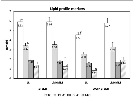 The serum lipid profile markers in patients with different PON1 L55M genotypes and diagnosis. The data are presented as mean ± SEM (standard error of mean). (a,b and c—differences between the STEMI and NSTEACS (UA + NSTEMI) with LL genotype; d—difference between the STEMI and NSTEACS (UA + NSTEMI) with LM + MM genotype; # and &—difference between LL and LM + MM genotypes of patients with NSTEACS).