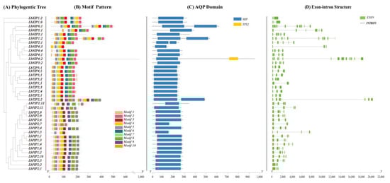 Figure 3. Phylogenic relationships, gene structure conserved domains, and conserved motif analyses. (A) A phylogenetic tree of LbAQP proteins was constructed with MEGAX software. (B) Conserved motif distribution of LbAQP proteins. The conserved motifs identified with MEME are displayed with boxes in different colors. A total of 10 motifs were identified. The scale at the bottom shows the length of the protein. (C) Predicted conserved structural domains of LbAQP proteins. Gray lines represent the length of each protein sequence, and conserved domains are indicated by colored boxes. (D) Exon-intron structures of the LbAQP genes. Gene structures were analyzed with Tbtools software. Exons and introns are indicated with green boxes and gray lines, respectively. The lengths of the exons and introns (bp) are indicated on the x-axis. The combined figure was illustrated with Tbtools software.