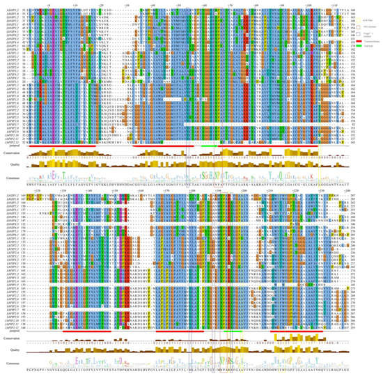 To identify the putative AQP proteins in L. barbarum (LbAQPs), the 35 AtAQPs in the A. thaliana genome were downloaded from the TAIR database (https://www.arabidopsis.org/) and were then used as queries to BLAST search the L. barbarum genome (https://www.ncbi.nlm.nih.gov/genome/81199?genome_assembly_id=1656998, acessed on 20 August 2022) with an E-value of e−10. Then, preliminary amino acid sequences that may have the function of LbAQPs were obtained according to the homology of AtAQPs. On this basis, conservative AQP domains obtained from the PFAM database (http://pfam-legacy.xfam.org/) were blast searched against these candidate sequences. Finally, amino acid sequences without conserved AQP domains and redundant sequences were manually removed.