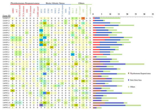 Figure 5. The cis-acting elements on the putative promoters of the LbAQP genes. The identified cis-acting elements were mainly divided into three major categories: phytohormone responsiveness, biotic/abiotic stress, and others.