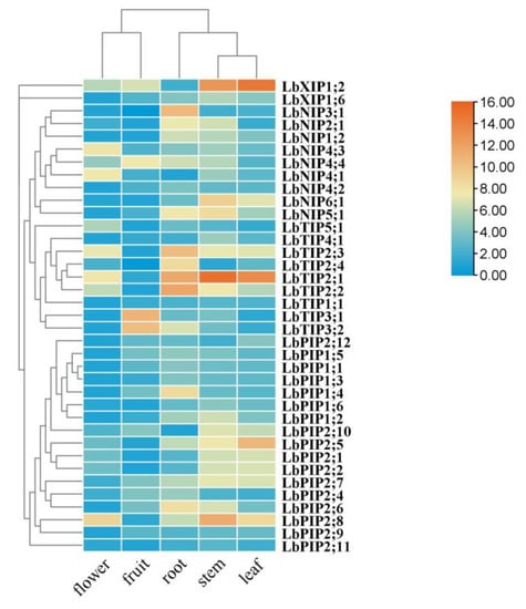 Figure 6. Tissue-specific expression of LbAQP genes. Tissue-specific expression of LbAQPs was determined by quantitative real-time PCR (qRT-PCR) in leaves, young roots, stems, ripening fruits, and flowers with gene-specific primers. qRT-PCR was performed in triplicate, and the fold changes were analyzed via the 2−ΔΔCT method using the LbACTIN1 gene as an internal control. Values are the means of three independent experiments.