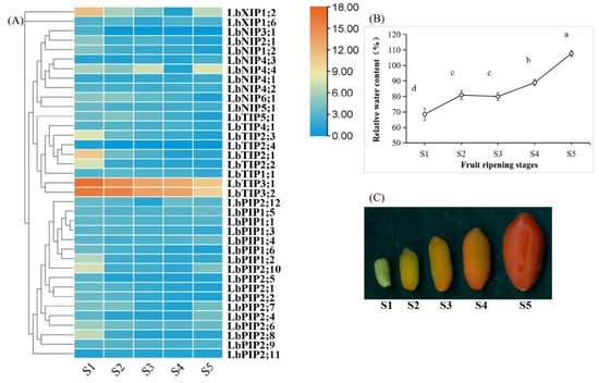 Figure 7. Development-dependent expression profiling during fruit ripening. (A) The transcript abundance of LbAQPs during fruit ripening was analyzed at five different developmental stages under their natural state. The fold changes in the relative expression levels were analyzed via the 2−ΔΔCT method using the LbACTIN1 gene as an internal control. Values are the means of three independent experiments. (B) Relative water content (%) of the fruits for the above five ripening stages. Values represent the mean ± SEM, n = 3 (biological replicates). Means with different letters are significantly different (p < 0.01; one-sided ANOVA). (C) Phenotypes of the five representative ripening stages (S1, S2, S3, S4, and S5) of L. barbarum fruits.