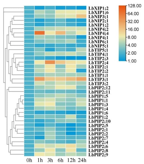 Figure 8. Expression profiling responses to heat stress. The expression levels of LbAQPs were measured in the leaves of 2-month-old L. barbarum subjected to 42 °C for 0, 1, 3, 12, or 24 h. The fold changes in the relative expression levels were analyzed via the 2−ΔΔCT method using the LbACTIN1 gene as an internal control. Values are the means of three independent experiments.