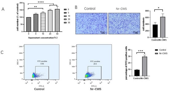 We first investigated the changes in the cell proliferation activity after applying different concentrations (0%, 5%, 10%, 25%, 50%) of the Nr-CWS on the RAW264.7 cells for 24 h. The proliferation activity of the RAW264.7 cells significantly increased with increasing concentrations (Figure 1A). To avoid the effect of proliferation, we then chose a 5% concentration of Nr-CWS for the subsequent experiments. Then, we measured the impact of Nr-CWS on the migratory activity of the RAW264.7 cells using a transwell assay. After 24 h, in comparison to the DMEM group, the number of migratory cells in the Nr-CWS group significantly increased (Figure 1B). Finally, we observed the effect of the Nr-CWS on RAW264.7 phagocytic activity, and the results were determined using a flow cytometer. The number of FITC-positive cells was significantly higher in the Nr-CWS group compared to the DMEM group (Figure 1C).