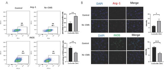 We used flow cytometry and immunofluorescence to identify the macrophage phenotypes to examine the effect of the Nr-CWS on the polarization of the RAW264.7 cells. In this study, Arg-1 and iNOS were used as specific markers for the M2 and M1 phenotypes, respectively. The RAW264.7 cells were initially considered to be the macrophage Mø. Analysis by flow cytometry showed that the percentage of iNOS-positive cells decreased, while the percentage of Arg-1-positive cells increased upon Nr-CWS treatment (Figure 2A). The immunofluorescence results also showed that the number of Arg-1-positive cells increased dramatically while the number of iNOS-positive cells decreased after Nr-CWS treatment (Figure 2B). This finding suggests that Nr-CWSs can promote the polarization of RAW264.7 cells toward M2 macrophages.