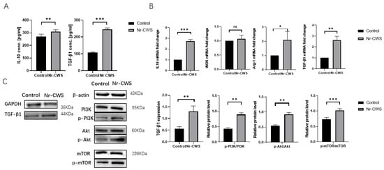 Expression of genes and proteins secreted by M2 macrophages. (A) An ELISA showed increased IL10 and TGF-β1 secretion in the Nr-CWS group. (B) qPCR showed increased expression of the M2 macrophage-related genes ARG1, IL10, and TGFβ1. (C) Protein levels of PI3K, Akt, mTOR, phosphorylated PI3K, Akt, mTOR and TGFβ were analyzed by western blotting. βactin and GAPDH were used as internal references. The statistics were analyzed in grayscale with ImageJ (ns—not significant, * p < 0.05, ** p < 0.01, *** p < 0.001 vs. control, paired t test).