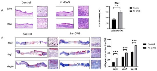 Finally, we evaluated the indices related to wound healing in mice. First, we filmed and recorded the wound changes in mice on days zero, two, four, seven, and ten. We calculated the wound area and healing rate by the formula: Healing rate = (original wound area—current measured area) ÷ original wound area × 100%. The Nr-CWS group showed a significantly higher healing rate and smaller wound area at each time point (Figure 6A). Then, we performed Masson staining on the wound tissue specimens on days three, seven, and ten to explore the collagen deposition in each group. The section dyed blue in the figure indicates the collagen fiber deposited in the wound. By calculating the collagen volume fraction, we found that the collagen volume fraction of the Nr-CWS group was significantly higher than that of the control group (Figure 4B). We also observed the H&E staining on day seven. The fibroblasts from the Nr-CWS group increased significantly compared with the control group. In addition, we calculated the thickness of the wound tissue and found that the thickness of the Nr-CWS group was significantly increased compared with the control group (Figure 4A). These results indicate that the Nr-CWS accelerated the regeneration of wound granulation.