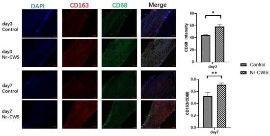In the animal experiments, we removed and fixed the tissue samples from the mice on days three, seven, and ten. Then, we dehydrated and embedded sections for relevant histopathological examination. When observing the H&E-stained sections on day three, we found that the Nr-CWS group had more inflammatory cell infiltration than the control group. (Figure 4A) We then analyzed the number and polarization of the macrophages through immunofluorescence, using CD68 as a total macrophage marker and CD163 as a specific marker for M2 macrophages. As observed in the immunofluorescence, the number of macrophages in the Nr-CWS group was significantly higher than in the control group on day three. We calculated the CD163/CD68 to derive the proportion of M2 macrophages and found that the proportion of M2 macrophages in the Nr-CWS group was significantly higher than in the control group on day seven (Figure 5A).