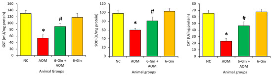 3.1. Effect of 6-Gingerol Treatment on Azoxymethane-Induced Colon Cancer through the Investigation of Antioxidant Enzyme Levels