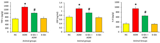 3.2. Effect of 6-Gingerol Treatment on Azoxymethane-Induced Colon Cancer through the Investigation of Inflammatory Protein Marker Levels