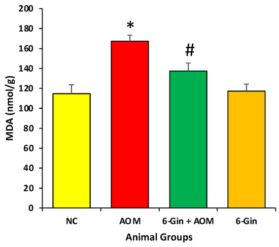 3.3. Effect of 6-Gingerol Treatment on Azoxymethane-Induced Colon Cancer through the Investigation of Lipid Peroxidation