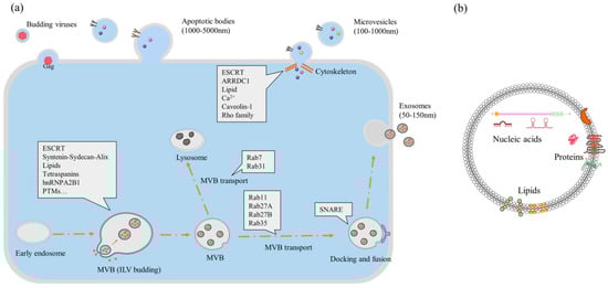 The biogenesis of the extracellular vesicle and its structure. (a) EVs can be divided into three subtypes: exosomes, microvesicles, and apoptotic bodies. (b) The extracellular vesicle is made up of lipid bilayers and enriched in proteins, nucleic acids, and lipids (The figure is cited from Jin Y, Ma L, Zhang W, Yang W, Feng Q, Wang H. Extracellular signals regulate the biogenesis of extracellular vesicles []).