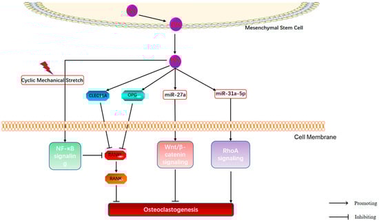 Osteoclasts, the main effector cells of bone resorption, play a crucial role in skeletal development and in the pathogenesis of bone diseases []. Osteoclasts are derived from the monocyte/macrophage lineage, which can enhance bone resorption activity by secreting acidic substances and proteases. The relative enhancement of osteoclast activity is the key cause of OP []. Previous studies found that BMSC-EVs transfer intrinsic miR-143/145 to osteoblasts to trigger osteoclast activity and differentiation by targeting Cd226 and Srgap2 []. Furthermore, Chen et al. [] found that osteoclast-associated genes such as Trap, MMP9, and Ctsk were repressed in OP mice treated with human urine-derived stem cells (USCs)-Exos and confirmed that collagen triple-helix repeat loaded in Exos-containing 1 (CTHRC1) and osteoprotegerin (OPG) proteins in Exos inhibited osteoclastogenesis. RANKL, as a member of the RANK/RANKL pathway, is essential in regulating bone remodeling []. RANKL secreted by osteoblasts binds to the receptor RANK on the surface of osteoclasts and their precursor cells to promote osteoclast survival and stimulate osteoblast maturation, proliferation, and differentiation []. Ren et al. [] found that Exos derived from adipose-derived stem cells (ADSCs) inhibited RANKL expression at the mRNA and protein levels and reduced the RANKL/OPG ratio, thereby improving osteocyte-mediated osteoclastogenesis in vitro. Moreover, Hu et al. [] revealed that the potently pro-osteogenic protein, CLEC11A (C-type lectin domain family 11, member A) encapsulated by HucMSC-EVs inhibits osteoclastogenesis by suppressing RANKL expression, thereby alleviating OP. OPG is a soluble protein that binds to RANKL to prevent RANKL from activating RANK. Lee et al. [] found that ADSC-EVs significantly inhibited the differentiation of macrophages to osteoclasts and promoted the migration of BMSCs, which in turn attenuated bone loss in OP mice. However, OPG-deficient ADSC-EVs did not exhibit an anti-osteoclastogenic effect. Further studies revealed that OPG in ADSC-EVs was involved in inhibiting osteoclast differentiation and reducing the expression of genes related to bone resorption []. The above studies suggest that OPG/RANKL/RANK signaling may be involved in cell-free therapy of OP by ADSC-EVs. Furthermore, Xiao et al. [] constructed hindlimb unloading-induced DOP mouse models to compare cyclic mechanical stretch (CMS)-treated BMSC-Exos (CMS-Exos) and normal static-cultured BMSC-Exos (static-Exos) in DOP. The results showed that although both CMS-Exos and static-Exos partially rescued mechanical unloading-induced OP, the CMS-Exo group exhibited a more significant therapeutic effect. Mechanistically, CMS-Exos impairs osteoclast differentiation by inhibiting the activity of the RANKL-induced NF-κB signaling pathway and ameliorates bone loss induced by mechanical unloading in a hindlimb unloading DOP mouse model. In addition, another study found that miR-27a released from MSC-EVs can inhibit osteoclast differentiation through the DKK2/Wnt/β-catenin signaling pathway []. In contrast, one study revealed that aged rat BMSC-Exo-miR-31a-5p positively regulates osteoclastogenesis by targeting RhoA signaling, thereby exacerbating OP [].