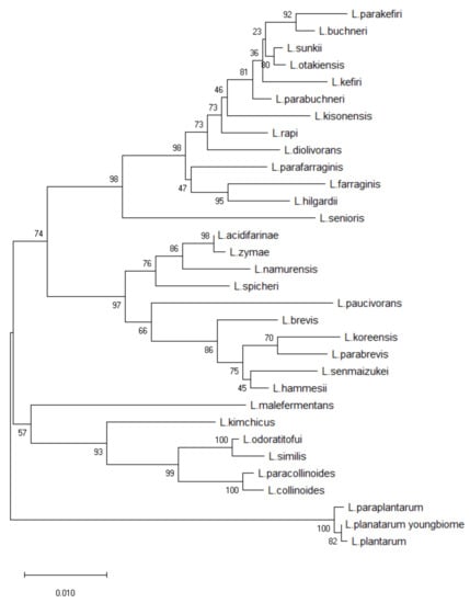 The genomic DNA isolation Kit (Gene all, Seoul, Korea) was used to isolate the genomic DNA of the strain, according to the manufacturer’s instructions. The 16S ribosomal RNA (rRNA) gene was amplified from chromosomal DNA of a strain using the universal bacteria primer sets, and the full sequence was assembled with SeqMan software version 7.1 (DNASTAR Inc., Madison, WI, USA). The 16S rRNA gene sequence similarities between the strains and other related Lactobacillus species were obtained from the GenBank database. Multiple sequence alignments were performed using the CLUSTAL X program and calculated using the two-parameter Kimura method. Finally, a phylogenetic tree was constructed with the neighbor-joining and maximum-parsimony methods using the MEGA7 Program.