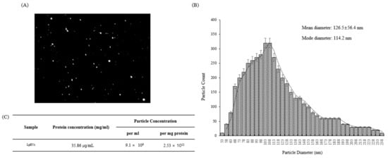 We isolated extracellular vesicles secreted from L. plantarum of women in their 20s using ultracentrifugation, analyzed LpEVs with a nanoparticle tracking analysis (NTA) video, and confirmed their size and distribution (Figure 3A). NTA analysis revealed that the LpEVs exist in exosome forms (Figure 3B). The EV particles had an average diameter of 126.5 ± 56.4 nm, an average size of 50–200 nm, and the concentration of EVs was 35.86 µg/mL (per ml). The number of particles per mL of EVs and mg of protein concentration was 9.1 × 109 per 1 mL, and 2.53 × 1011 per 1 mg of protein (Figure 3C). From these results, we determined that L. plantarum isolated from the skin of women in their 20s actively secretes EVs, with sizes that range from 50 to 200 nm.