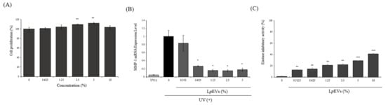 Evaluation of the effects of LpEVs on MMP-1 mRNA expression levels using RT-PCR in CCD986sk: (A) cell Proliferation of LpEVs in CCD986sk dermal fibroblasts. Cell proliferation assays were performed on cells treated with LpEVs in a dose dependent manner (** p < 0.01); (B) the MMP-1 expression levels in CCD986sk after irradiation of UVA and treatment of LpEVs (* p < 0.05); (C) the elastase inhibitory activity was measured in a dose dependent manner in CCD986sk (** p < 0.01, *** p < 0.001).