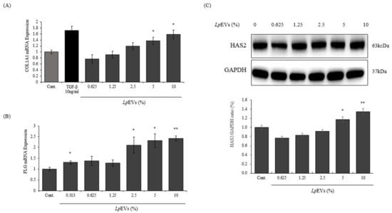 Evaluation of the effects of LpEVs on collagen, filaggrin, and HAS2 expression levels in CCD986sk: (A) collagen mRNA expression levels (* p < 0.05); (B) filaggrin mRNA levels (* p < 0.05, ** p < 0.01); (C) HAS2 protein levels in CCD986sk after 24h of treatment (* p < 0.05, ** p < 0.01).