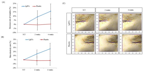 Ultraviolet radiation or damage caused by aging reduce skin elasticity and cause wrinkle formation [46,47]. We conducted clinical assessments on 16 skin wrinkles around the eyes of women in their 50s, on average, to determine whether LpEVs can restore the aging index in aging skin (Table 2). We applied LpEVs (or placebo EVs) to the wrinkles around the eye, and the wrinkles were measured at 0, 2, and 4 weeks with the Antera 3D. The indentation index value (A.U.), which determines the degree of wrinkles around the eyes, decreased by 8.9% at 2 weeks and 15.89% at 4 weeks compared to week 0, whereas there was no change in the placebo group (Figure 6A). Skin elasticity improved by 14.76% at 2 weeks and by 27.07% at 4 weeks (Figure 6B). The Antera 3D image showed that treatment of LpEVs gradually decreased the distribution and formation of wrinkles at 2 and 4 weeks. In contrast, it was difficult to confirm a significant wrinkle change in the placebo group (Figure 6C). These results suggest that LpEV treatment improves skin elasticity and suppresses wrinkle formation.