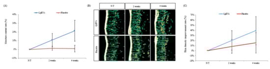 A major characteristic of skin aging is the change in moisture content and skin density. The moisture content of the skin decreases as the skin barrier weakens, and skin density is also reduced due to a decrease in the ECM [45,48,49]. Therefore, we tried to assess whether LpEVs can affect and improve the water content and density in the skin. Unlike the placebo group, which had no significant effect, the LpEVs increased water content by 10.79% at 2 weeks and 21.40% at 4 weeks (Figure 7A). We confirmed that skin density increased at the 2-week and 4-week assessments in both groups, using ultrasound (Figure 7B). Image quantification images showed an increase in skin density, but the increased rate of the density (39.30%) of the LpEV group was higher than that of the placebo (15.19%) (Figure 7C). Therefore, we confirmed that LpEVs suppress the reduction in skin moisture content and increase skin density.