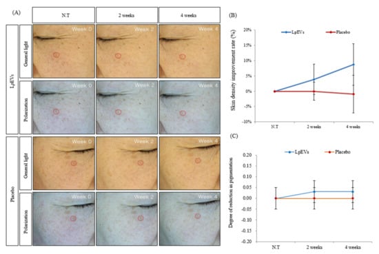 Another factor of skin aging is skin pigmentation [50]. We investigated whether the LpEVs had a whitening effect that suppressed pigmentation caused by aging. As a result, for patients treated with LpEVs, unlike the placebo, the pigmentation of the lesion sites was decreased at the 2-week and 4-week assessments (Figure 8A,C). In the LpEV treatment group, skin density improved by 3.87% at 2 weeks and 8.7% at 4 weeks (Figure 8B). Therefore, these data showed that LpEVs have an effect on pigmentation caused by skin aging. Consequently, LpEVs have a great anti-aging effect.