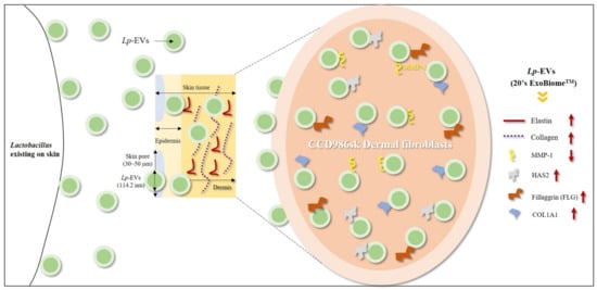 Lactobacillus plantarum is a Gram-positive member of the genus Lactiplantibacillus, is rod-shaped and 3–8 μm in length [19], and produces lactic acid [20]. L. plantarum is found in many fermented products and has been associated with reducing allergic reactions as a probiotic, and lowering cholesterol and triglyceride levels [21,22,23,24]. In particular, L. plantarum suppresses various harmful Gram-positive and Gram-negative bacteria by secreting an antimicrobial substance from the human gastrointestinal tract [25,26]. L. plantarum, which is an aerotolerant Gram-positive bacteria, is also found on the skin, and research on the interactions with the skin are currently in progress [27,28,29,30]. However, the effect of LpEVs on skin wrinkle formation not have been studied.