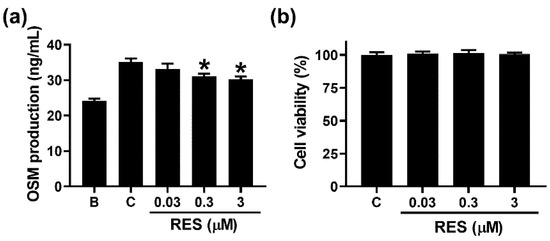 Effects of RES on the production of OSM in neutrophil-like dHL-60 cells. (a) dHL-60 cells (5 × 105) were exposed to RES (0.03 to 3 μM) for 1 h, and then stimulated with GM-CSF (5 ng/mL) for 4 h. (b) Cytotoxicity was examined using an MTT assay. B, PBS-added and unstimulated cells; C, PBS-added and GM-CSF-stimulated cells. Data are shown as the mean ± SEM of three independent experiments. * p < 0.05 vs. the PBS-added, and GM-CSF-stimulated cells.