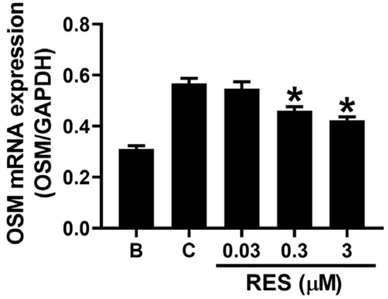 Effects of RES on the mRNA expression of OSM in neutrophil-like dHL-60 cells. dHL-60 cells (1 × 106) were exposed to RES (0.03 to 3 μM) for 1 h, and then stimulated with GM-CSF (5 ng/mL) for 1 h. B, PBS-treated and unstimulated cells; C, PBS-treated and GM-CSF-stimulated cells. B, PBS-added and unstimulated cells; C, PBS-added and GM-CSF-stimulated cells. Data are shown as the mean ± SEM of three independent experiments. * p < 0.05 vs. the PBS-added and GM-CSF-stimulated cells.