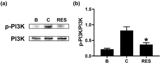 Effects of RES on the phosphorylation of PI3K in neutrophil-like dHL-60 cells. (a) dHL-60 cells (5 × 106) were exposed to RES (3 μM) for 1h, and then stimulated with GM-CSF (5 ng/mL) for 15 min. (b) The protein levels were quantitated by densitometry. B, PBS-added and unstimulated cells; C, PBS-added and GM-CSF-stimulated cells; RES, RES-added and GM-CSF-stimulated cells. Data are shown as the mean ± SEM of three independent experiments. * p < 0.05 vs. the PBS-added and GM-CSF-stimulated cells.