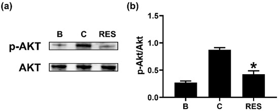 Effects of RES on the phosphorylation of Akt in neutrophil-like dHL-60 cells. (a) dHL-60 cells (5 × 106) were exposed to RES (3 μM) for 1h, and then stimulated with GM-CSF (5 ng/mL) for 30 min. (b) The protein levels were quantitated by densitometry. B, PBS-added and unstimulated cells; C, PBS-added and GM-CSF-stimulated cells; RES, RES-added and GM-CSF-stimulated cells. Data are shown as the mean ± SEM of three independent experiments. * p < 0.05 vs. the PBS-added and GM-CSF-stimulated cells.
