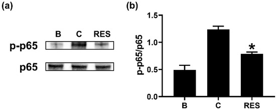 Effects of RES on the phosphorylation of NF-kB in neutrophil-like dHL-60 cells. (a) dHL-60 cells (5 × 106) were exposed to RES (3 μM) for 1h, and then stimulated with GM-CSF (5 ng/mL) for 1 h. (b) The protein levels were quantitated by densitometry. B, PBS-added and unstimulated cells; C, PBS-added and GM-CSF-stimulated cells; RES, RES-added and GM-CSF-stimulated cells. Data are shown as the mean ± SEM of three independent experiments. * p < 0.05 vs. the PBS-added and GM-CSF-stimulated cells.