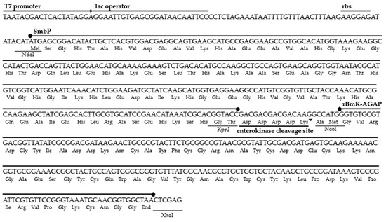 The amino acid sequence belonging to the BmK-AGAP peptide was located in the NCBI GenBank database (accession number AAP34332.1). The gene was synthesized and optimized for expression in E. coli. We added the restriction sites NcoI at the 5′ end and XhoI at the 3′ end to be inserted downstream of the SmbP fusion protein and the enterokinase cleavage site sequences in the expression vector pET30a(+). The six nucleotides of the NcoI restriction site and two extra nucleotides code for three additional amino acids (Ala, Met, and Gly), these extra nucleotides being added to avoid shifting the open reading frame. Figure 1 details the DNA and amino acid sequences for the SmbP_BmK-AGAP construct.