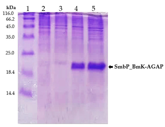 SDS-PAGE (15%) analysis of SmbP_BmK-AGAP small-scale expression. Lane 1: protein marker; Lane 2 and 3: lysates from untransformed and uninduced cells respectively; Lane 4 and 5: lysates from two different colonies of E. coli SHuffle cells expressing SmbP_BmK-AGAP (calculated molecular weight: 18.2 kDa).