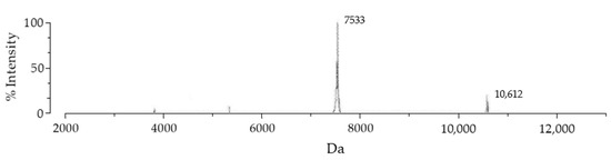 MALDI-TOF MS spectrum of the rBmK-AGAP peptide. After the second purification step, the peptide was analyzed with the VITEK MS (BIOMERIEUX) mass spectrometer using α-Cyano-4-hydroxycinnamic acid as the matrix. The 7533 peak coincided with rBmK-AGAP, while the 10,612 value corresponded to free SmbP present in the sample.